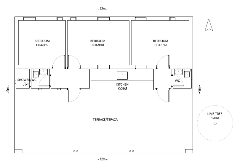 Много солидна конструкция - бетонен под, покрив и колони, тухлени стени, алуминиев двоен стъклопакет, всичко това поддържа спалните прохладни през горещите летни дни.